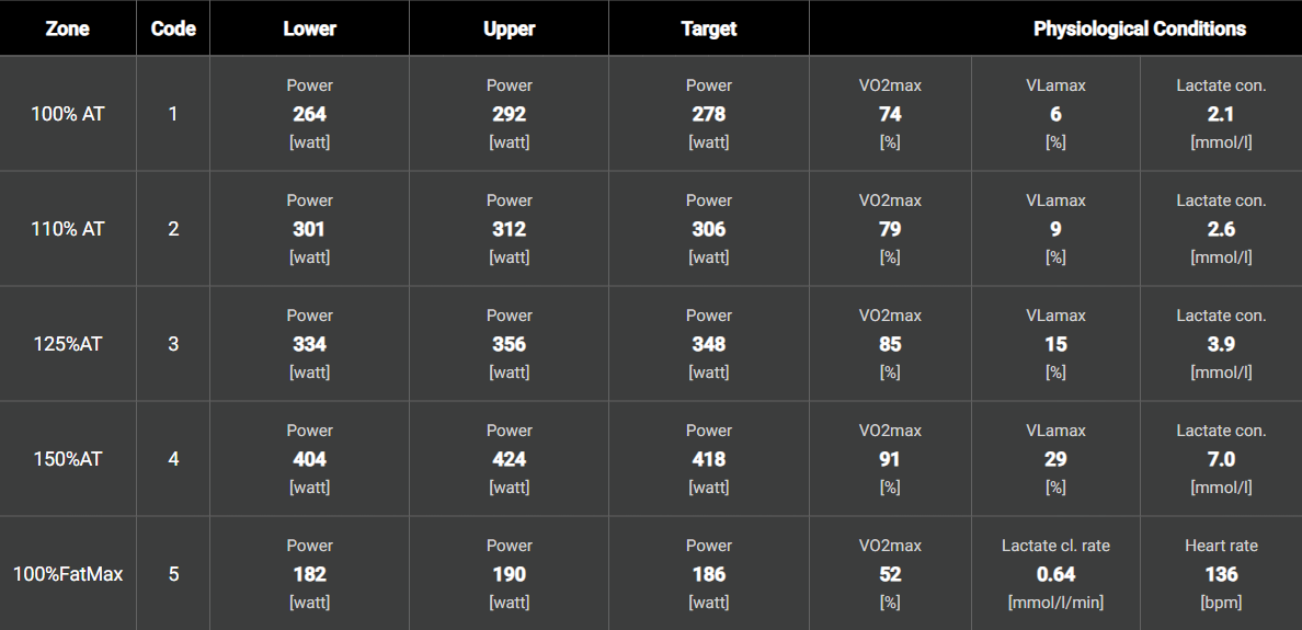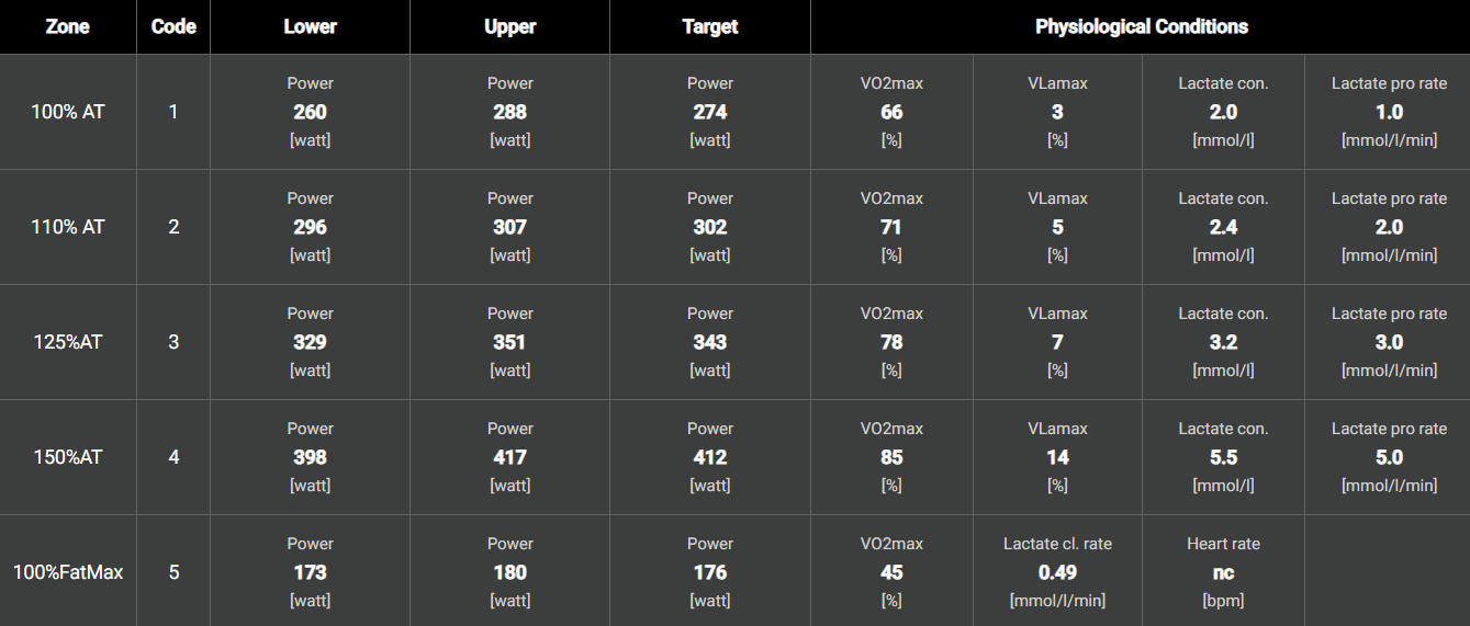 Dalla tabella a piè di pagina vediamo che il nostro atleta al 110%FTP inizia ad avere un discreto stimolo sulla VO2max (79%) e un basso stimolo (9%) sulla Vlamax. E' fondamentale per il miglioramento della FTP/MLSS/AT/LT2 che ci sia uno stimolo adeguato sulla VO2max (>79%) e allo stesso tempo uno stimolo insufficiente sulla Vlamax (<10%).